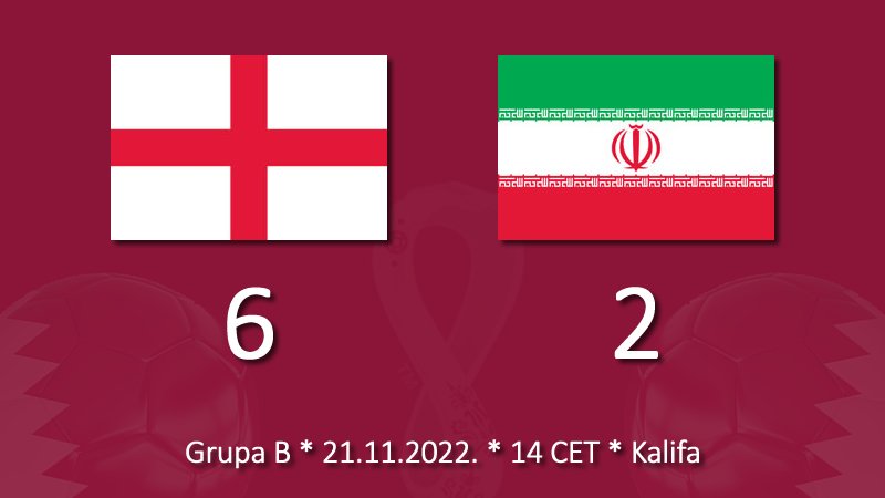Fudbaleri reprezentacije Engleske savladali su Iran rezultatom 6:2 (3:0).